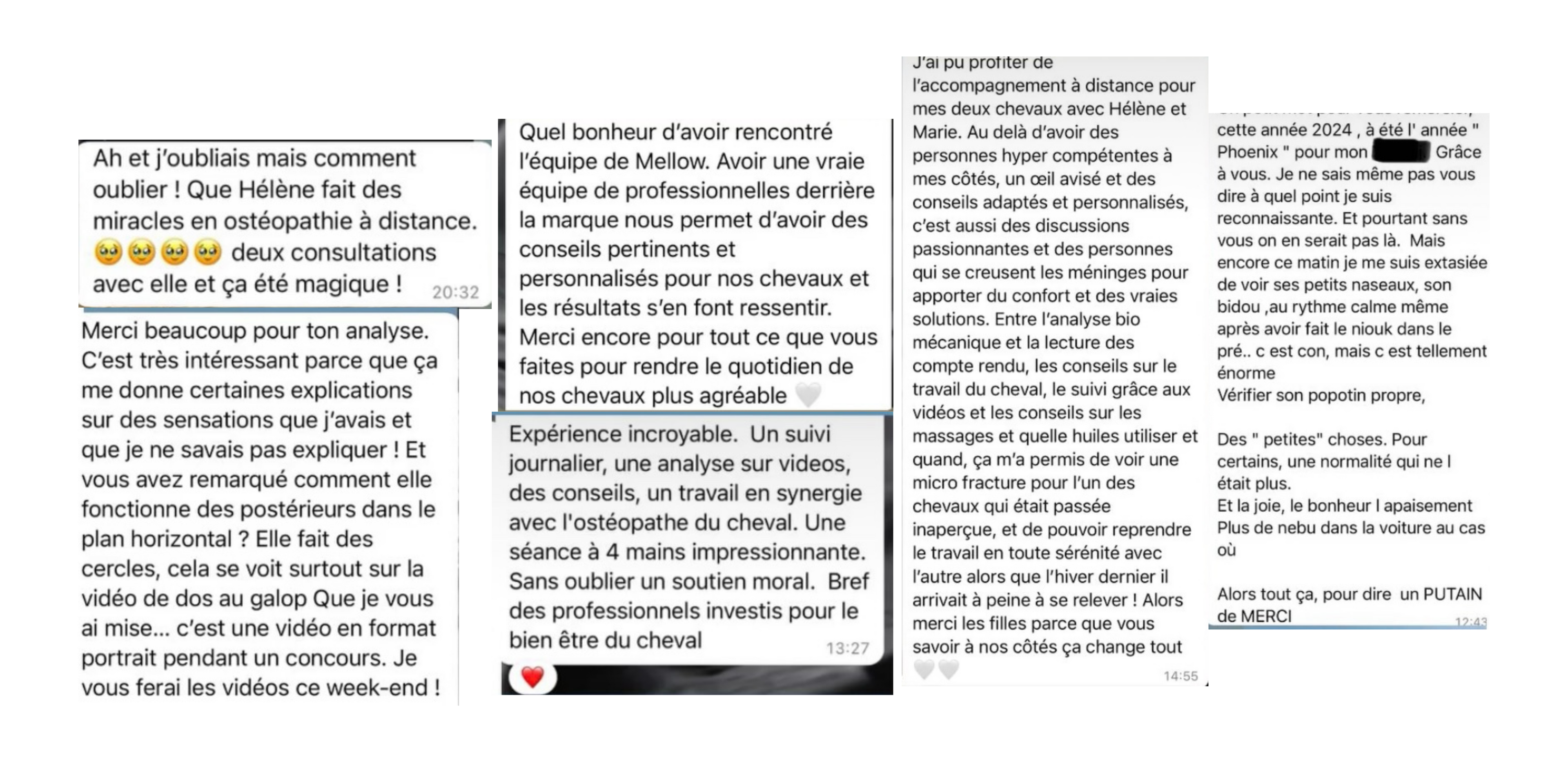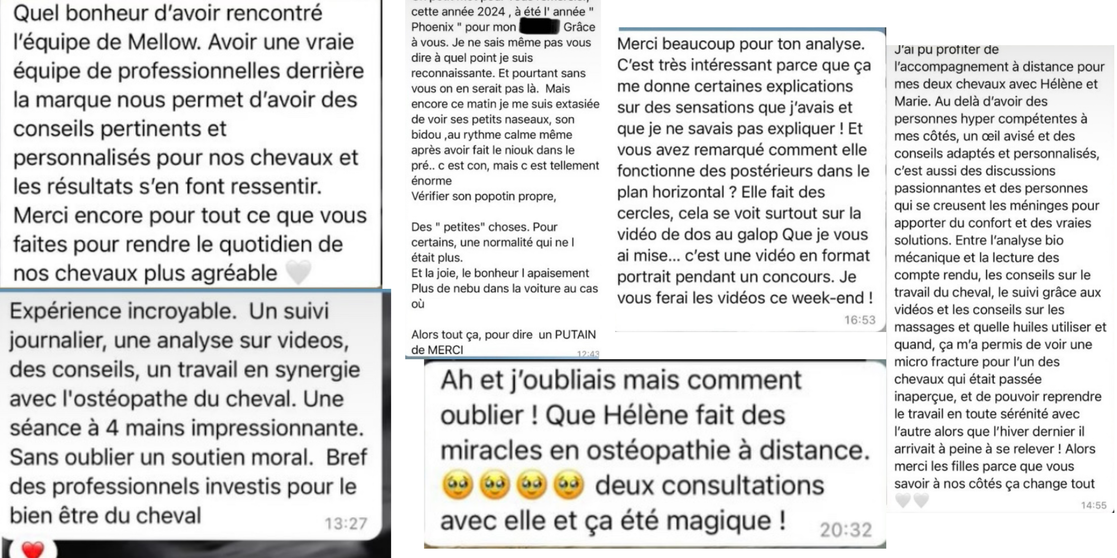 Nous avons une équipe de collaboratrices dans différents domaines d'expertises vers qui nous pourrons t'orienter si besoin, en fonction des besoins de ton cheval (naturopathe - nutritionniste, equicienne, communicatrice animale etc ...) ainsi qu'une équipe de thérapeutes dans différentes régions vers qui nous pourrons te référer si besoin.